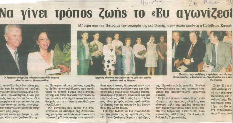 Ευ Αγωνίζεσθαι Η Πανελλαδική Οργάνωση Γυναικών ΠΑΝΑΘΗΝΑΪΚΗ Παράρτημα Πάτρας στις 25 Μαίου 2001 υποδεχτηκε στο Δημοτικό Θεατρο Απολλών, σε μια μεγάλη εκδήλωση την Πρέσβειρα του Ευ Αγωνίζεσθαι κυρία Κατερινα Παναγοπούλου.