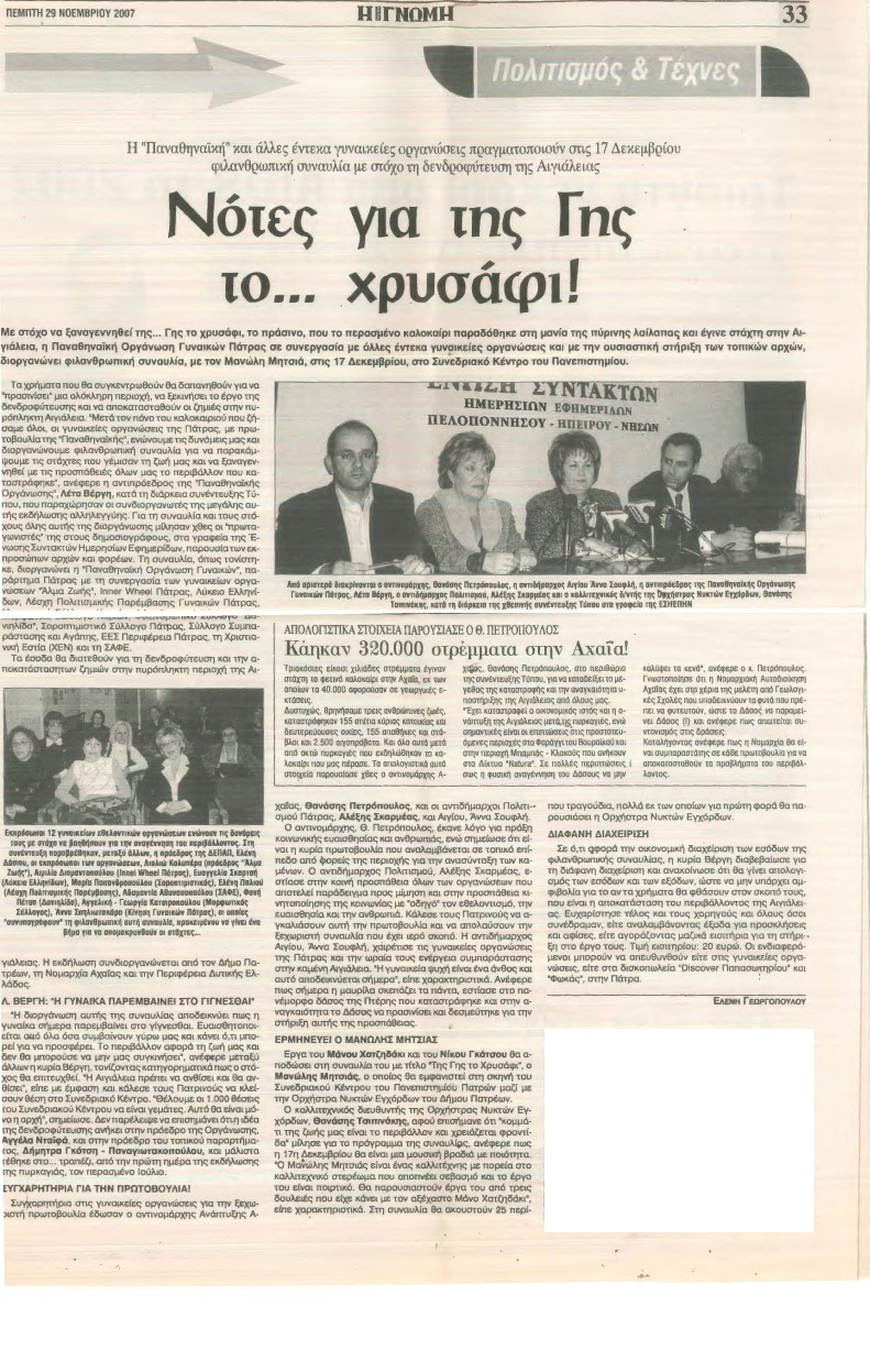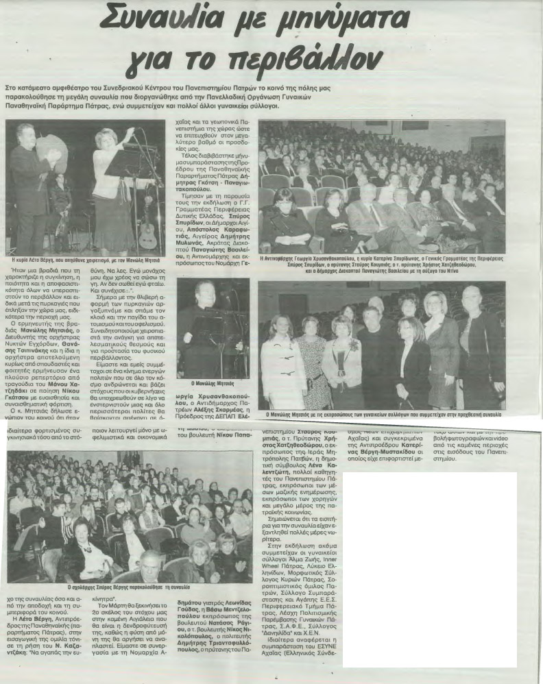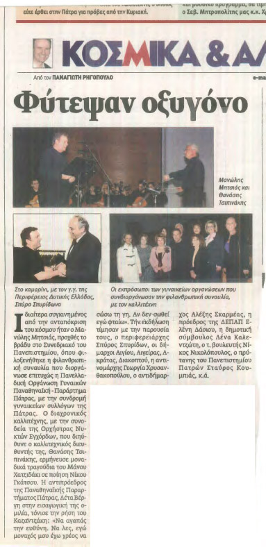 Η Πανελλαδική Οργάνωση Γυναικών ΠΑΝΑΘΗΝΑΪΚΗ Παράρτημα Πάτρας σε συνεργασία με τις γυναικείες οργάνωσης της περιοχής μας πραγματοποίησε μεγαλιώδη συναυλία με το Μανώλη Μητσιά στο συνεδριακό κέντρο του Πανεπιστημίου Πατρών.
