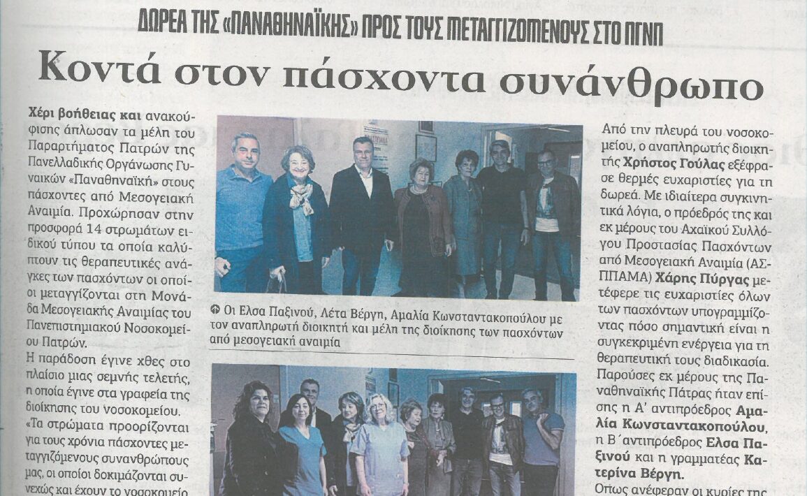 Την Δευτέρα 20 Οκτωβρίου, η Πανελλαδική Οργάνωση Γυναικών Παναθηναϊκή Παράρτημα Πάτρας, σε μία συγκινησιακή φορτισμένη τελετή, παρέδωσε 14 στρώματα ειδικού τύπου στο Νοσοκομείο του Ρίου. «Τα στρώματα προορίζονται για τους χρόνια πάσχοντες μεταγγίζομενους συνανθρώπους μας, οι οποίοι δοκιμάζονται συνεχώς και έχουν το νοσοκομείο σαν δεύτερο σπίτι τους», δήλωσε η πρόεδρος της Παναθηναϊκής Πάτρας, Λέτα Βέργη. Στην τελετή παρέστησαν ο Αναπληρωτής Διοικητής του ΠΓΝΠ κ.Γούλας, εκ μέρους της Παναθηναϊκής Πάτρας η Α Αντιπρόεδρος κα.Αμαλία Κωνσταντακοπούλου, η Β Αντιπρόεδρος κα.Ελσα Παξινού και η Γραμματέας κα.Κατερίνα Βέργη και εκ μέρους του ΑΣΠΠΑΜΑ ο Πρόεδρος κ.Χάρης Πύργας και μέλη τους Διοικητικού Συμβουλίου. Η Πανελλαδική Οργάνωση Γυναικών Παναθηναϊκή Πάτρας, με συνεχόμενες δράσεις ανακουφίζει και συνδράμει σε πονεμένους συνανθρώπους μας μέσω φιλανθρωπικών, πολιτισμικών και ενημερωτικών δράσεων.