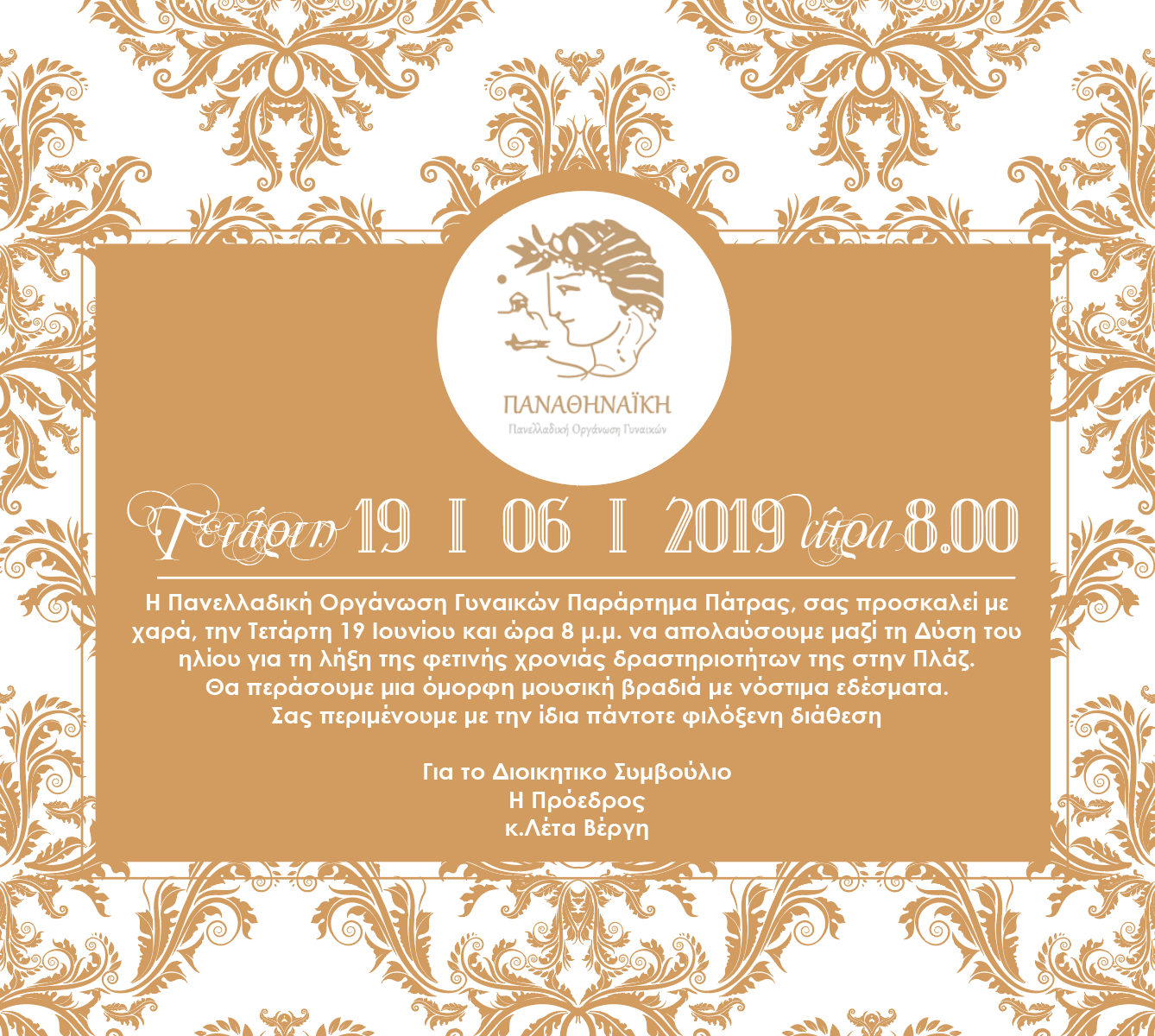 Μετά από μια χρονιά δράσεων με φιλανθρωπικούς κ’ πολιτιστικούς στόχους η Πανελλαδική Οργάνωση Γυναικών ΠΑΝΑΘΗΝΑΪΚΗ Παράρτημα Πάτρας διοργάνωσε μια πολύ ωραία βραδιά για τη λήξη των εργασιών της.