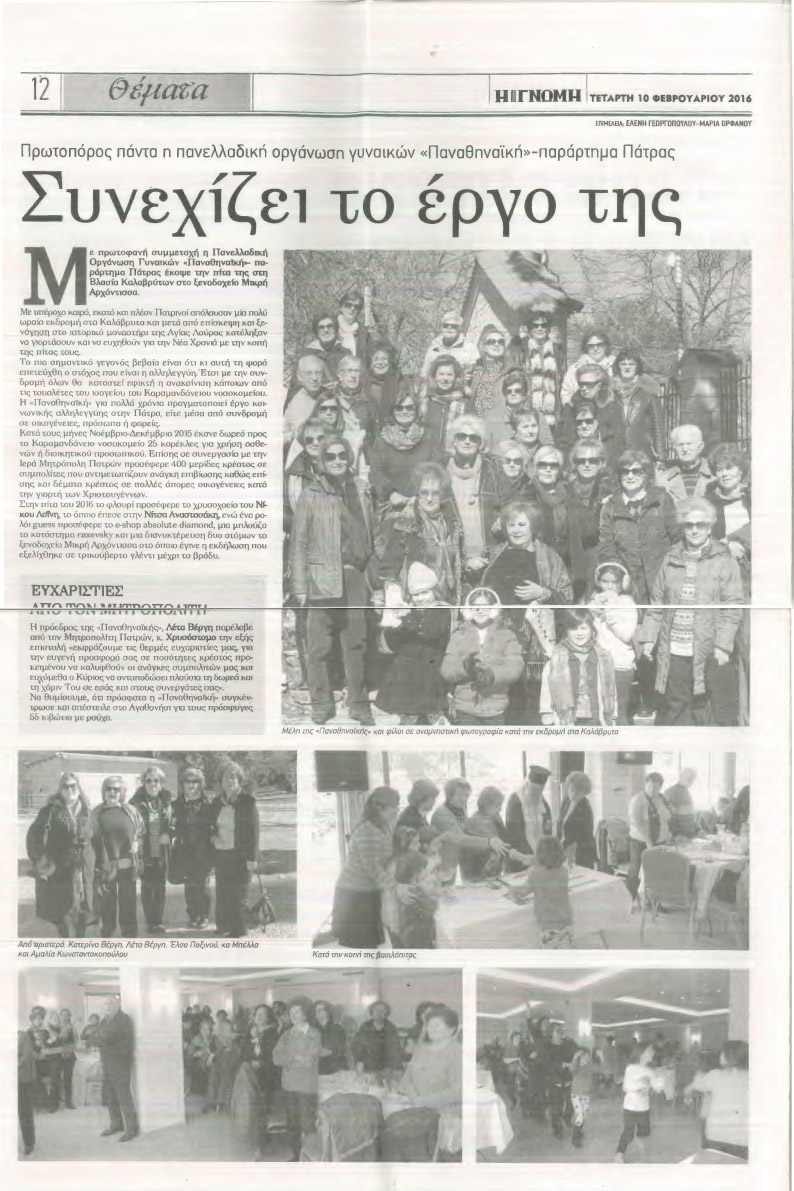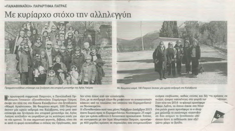 Η Πανελλαδική Οργάνωση Γυναικών ΠΑΝΑΘΗΝΑΪΚΗ Παράρτημα Πάτρας έκοψε την πίτα της για το έτος 2016 συνδιαζοντάς τη με μία υπέροχη εκδρομή στα Καλάβρυτα.